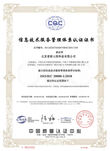信息技术服务管理体系认证证书:ISO/IEC 20000-1:2018