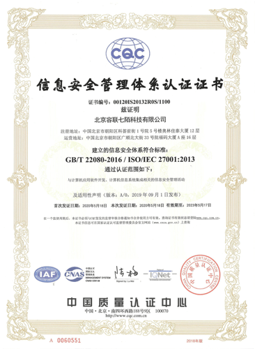 信息安全管理体系认证证书:ISO/IEC 27001:2013